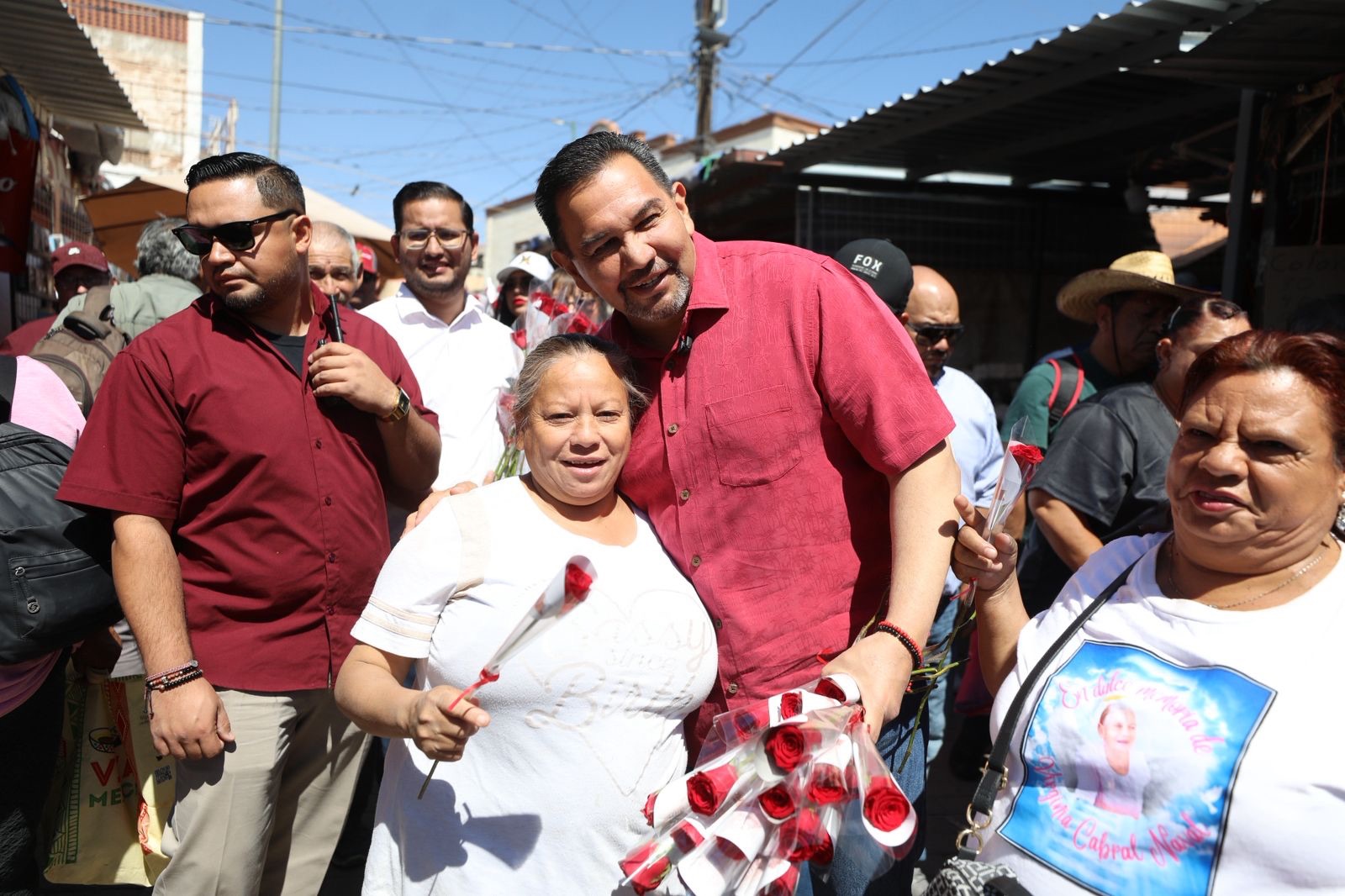 Desde temprana hora, el alcalde comenzó el recorrido en el mercado Cuauhtémoc, donde entregó rosas a las mamás presentes, las felicitó y convivió con ellas. Posteriormente, continuó con su visita en las calles La Paz y Velarde, saludando y agradeciendo personalmente a decenas de mujeres por su esfuerzo diario.