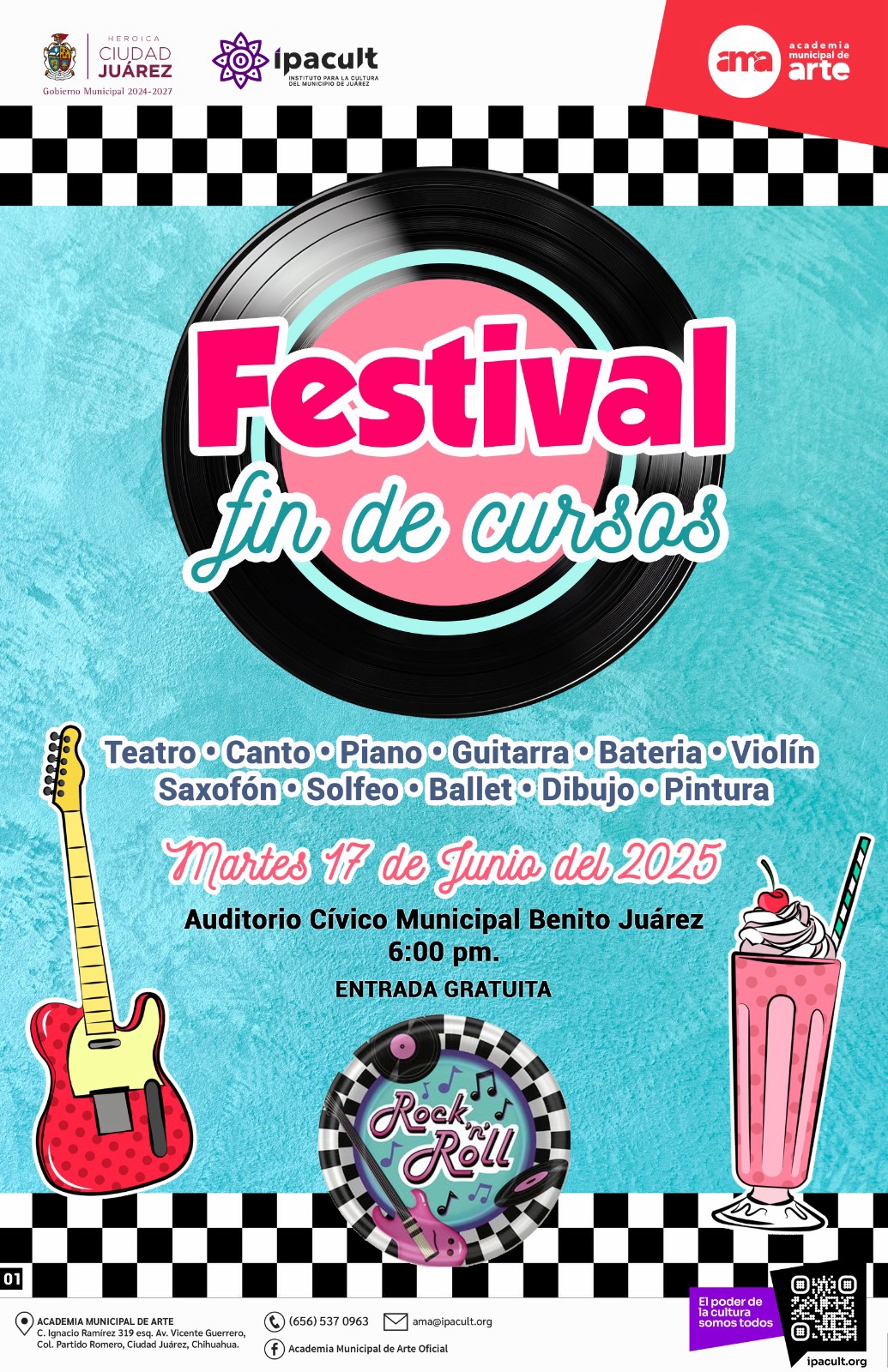 Ciudad Juárez.- El Instituto para la Cultura del Municipio de Juárez (IPACULT) invitó a la comunidad a asistir al Festival de Fin de Cursos de la Academia Municipal de Arte (AMA), que se llevará a cabo este martes 17 de junio a las 6:00 de la tarde en el Auditorio Cívico Municipal Benito Juárez.