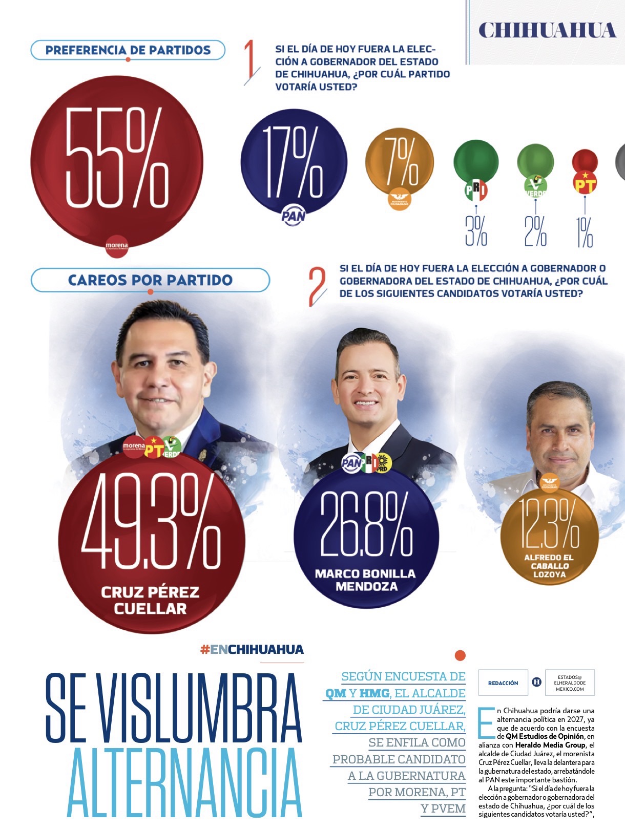 En el caso de Chihuahua, la encuesta de QM Estudios de Opinión posiciona a Cruz Pérez Cuéllar con una amplia ventaja. De acuerdo con los resultados, el aspirante de Morena lidera con un 49.3% de aceptación, muy por encima de Marcó Bonilla, quien aparece en segundo lugar con un 26.8%.